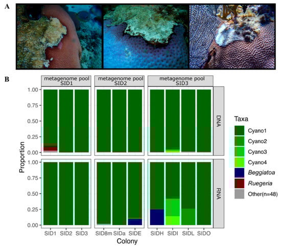 - Meyer, J.L.; Paul, V.J.; Raymundo, L.J.; Teplitski, M. Comparative Metagenomics of the Polymicrobial Black Band Disease of Corals. Front. Microbiol. 2017, 8, 618. [Google Scholar] [CrossRef] [PubMed]
