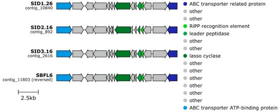 - Gilchrist, C.L.M.; Chooi, Y.-H. Clinker & Clustermap.js: Automatic Generation of Gene Cluster Comparison Figures. Bioinformatics 2021, 37, 2473–2475. [Google Scholar] [CrossRef]
