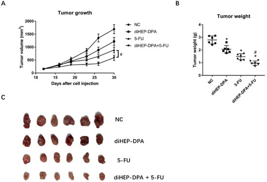Effects of diHEP-DPA and 5-FU on tumor growth and tumor weight. (A) Tumor mass volumes in BALB/c mice intraperitoneally injected with saline (control), diHEP-DPA (10 μg/kg/day), 5-FU (20 mg/kg/five times a week), or both diHEP-DPA (10 μg/kg/day) and 5-FU (20 mg/kg/five times a week). (B) Tumor weight after sacrifice on day 30. (C) Tumors excised after sacrifice on day 30. Data are expressed as mean ± SD; n = 6 per group. * p < 0.05 compared with the control group; # p < 0.05 compared with the 5-FU group.