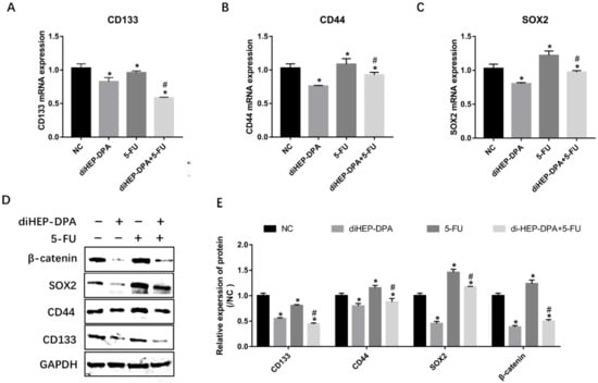 Effects of diHEP-DPA and 5-FU on cancer stem cells via the WNT/β-catenin signaling pathway. Relative mRNA levels of (A) CD133, (B) CD44, and (C) SOX2 were determined by qRT-PCR in isolated tumors. (D) The protein levels of CD133, CD44, SOX2, and β-catenin were detected by western blotting in isolated tumors. (E) The relative levels of CD133, CD44, SOX2, and β-catenin were calculated by ImageJ. Data are expressed as mean ± SD; n = 3 per group. * p < 0.05 compared with the control group; # p < 0.05 compared with the 5-FU group.