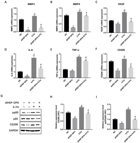 Effects of diHEP-DPA and 5-FU on the infiltration of M2-like TAMs and the NF-κB signaling pathway. Relative mRNA levels of TAMs secretions including (A) MMP2, (B) MMP9, (C) VEGF, (D) IL-6, and (E) TNF-α in isolated tumors. Relative mRNA levels of (F) CD206 were determined via qRT-PCR. (G) The protein levels of CD206, p65, and pp65 were detected by western blotting in isolated tumors. The relative levels of (H) CD206 and (I) pp65/p65 were calculated using ImageJ. Data are expressed as mean ± SD; n = 3 per group. * p < 0.05 compared with the control group; # p < 0.05 compared with the 5-FU group.