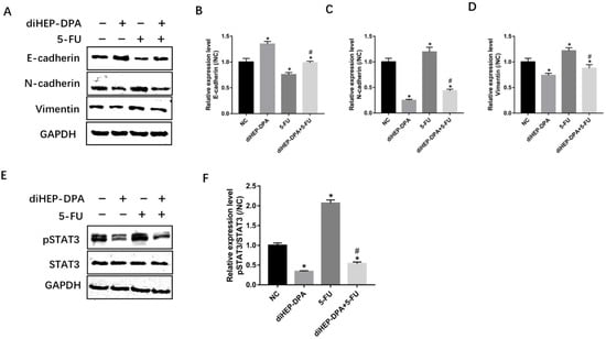 Effects of diHEP-DPA and 5-FU on EMT via the STAT3 signaling pathway. (A) The level of E-cadherin, N-cadherin, and vimentin were detected by western blotting. The relative expression of (B) E-cadherin (C) N-cadherin, and (D) vimentin were calculated by ImageJ. (E) The level of STAT3 and pSTAT3 were detected by western blotting in isolated tumors and (F) were calculated by ImageJ. Data are expressed as mean ± SD; n = 3 per group. * p < 0.05 compared with the control group; # p < 0.05 compared with the 5-FU group.