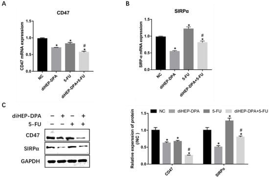 The disruption of the CD47/SIRPα axis reduces the ability of the tumor to escape phagocytosis [24]. Hence, we evaluated the effects of diHEP-DPA and 5-FU on SIRPα and CD47 expression in tumor tissues. diHEP-DPA alone significantly reduced the gene levels of CD47 and SIRPα compared with the control; 5-FU downregulated the expression of CD47 but upregulated the expression of SIRPα; the combination of diHEP-DPA and 5-FU was proven to downregulate the expression of CD47 and SIRPα compared with the 5-FU group (Figure 6A,B). Accordingly, the western blotting results showed similar trends (Figure 6C). These findings demonstrated the powerful effect of diHEP-DPA combined with the 5-FU on phagocytic activity via the CD47/SIRPα axis.