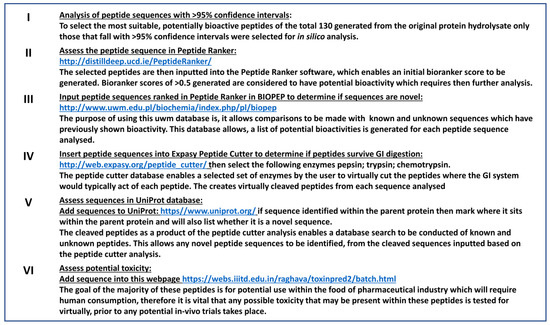 Figure 1 shows the six steps used during in silico analysis. Of the 130 peptides identified using MS, only those with >95% confidence were selected for synthesis and in silico analysis. Selected peptides were input into the software programme Peptide Ranker (http://distilldeep.ucd.ie/PeptideRanker/, accessed on 15 December 2022). A value indicative of potential bioactivity was obtained for each peptide. Only peptides with Peptide Ranker scores greater than 0.5 were used in further analysis. Ten peptide sequences were identified as having potential bioactivities. The novelty of these peptides was determined following a search in the peptide database BIOPEP (http://www.uwm.edu.pl/biochemia/index.php/pl/biopep, accessed on 12 December 2022). Active peptides were further assessed for their ability to survive simulated GI digestion using Expasy peptide cutter (http://web.expasy.org/peptide_cutter/, accessed on 10 December 2022). The UniProt database was used to identify proteins containing the peptide sequences. Additionally, the potential toxicity of identified peptides was assessed using the software programme ToxinPred (https://webs.iiitd.edu.in/raghava/toxinpred2/batch.html, accessed on 10 December 2022).