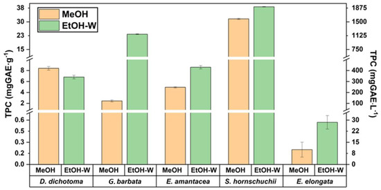 TPC values for the five analyzed algae. MeOH (methanol), EtOH-W (ethanol/water, 50:50, v/v).