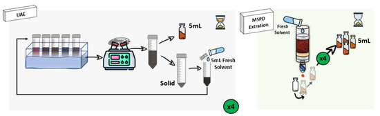 One important point to be considered in the recovery of bioactive compounds from the algae is the extraction procedure. As was commented, UAE has been the most widely applied to this matrix, showing different advantages such as the possibility of performing simultaneous extractions [26,27,28]. However, its main drawback is that the effect of the ultrasound waves cannot be homogeneous during the extraction time, and several authors have reported that although the use of high temperatures usually leads to a kinetic improvement, most phenolics are not thermostable, so the heat treatments could reduce their total extracted amount [8,29]. Besides, centrifugation of UAE derived extracts is usually required to separate the extract containing the compounds of interest from the algae residue, increasing the number of steps necessary for the sample preparation, and resulting in a higher extraction time and energy consumption [30]. Due to the complexity of the sample matrix, a technique capable of breaking the algae cells to release the bioactive compounds is necessary [31,32]. In this way, the use of MSPD results in a very suitable tool [33]. Both experimental procedures are described in Section 3.3 and depicted in Figure 2.