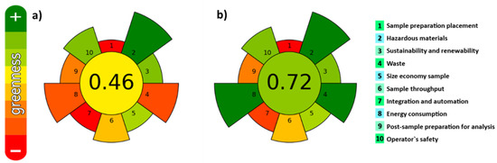 Evaluation of the degree of greenness. Pictograms obtained for (a) UAE; (b) MSPD.