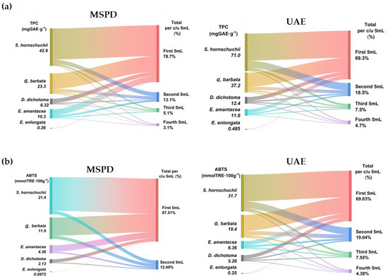 The IC50 value, a parameter widely employed to measure the antioxidant activity of bioactive extracts, was also assessed and the results are summarized in Figure 5a for the first aliquot of 5 mL obtained by UAE and MSPD procedures.