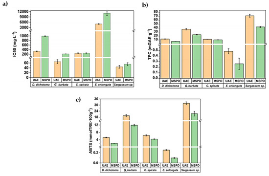 The IC50 value was calculated as the concentration of antioxidants needed to decrease the initial ABTS concentration by 50% (experimental details are shown in Section 3.5). Thus, lower IC50 values represent higher antioxidant activity. As can be seen in Figure 5a, IC50 values ranged between 44 mg/L (for S. hornschuchii) and 11,040 mg/L (for E. enlongata). As was previously commented, there is a lack of information in the literature regarding the characterization of these algae. However, the obtained IC50 values are below those reported by other authors for brown macroalgae, Sargassum binderi (36,627 mg/L), and Turbinaria conoides (96,242 mg/L) from the Gulf of Thailand [39,40], employing water as the extractant. The obtained IC50 values in this work are also lower than those reported for Sargassum muticum (450–520 mg/L) from the Cost of Brittani (France) after employing classical solid-liquid extraction and the advanced technique centrifugal partition extraction (CPE) using ethanol/water (50:50, v/v). These results demonstrate the great antioxidant potential of the extracts obtained from these algae from the Adriatic Sea. Figure 5b,c show the corresponding TPC and AA values, respectively, for the first 5 mL aliquots obtained by MSPD and UAE. The direct correlation among them is clear (Figure 5b,c), indicating that polyphenols (mainly phlorotannins) are the key compounds that reduce oxidation and being responsible for ABTS scavenging capability of the algae extracts.