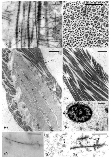 The autotomy structures, as shown here for Eupentacta quinquesemita, comprise complex tissue strata. They contain collagen fibrils (banding periodicity, 60–67 nm), unstriated microfibrils, ECM and a range of cellular inclusions (see below) (Figure 2a,b,e–h). Some of the unstriated microfibrils are attached to and often cross between collagen fibrils while others are isolated in the connective tissue matrix (Figure 2a,g,h).