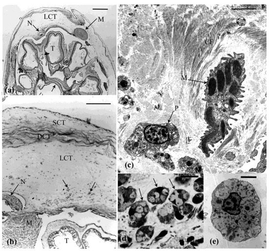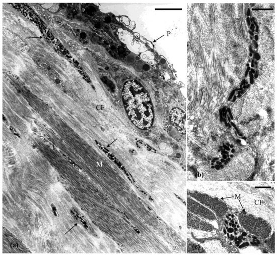 Phagocytes and morula cells are abundant in the connective tissue (Figure 3c–e and Figure 5a). Morula cells appear to function in the maintenance of connective tissue as a source of ECM [43]. Their synthetic activity involves production of matrix and fibrillar material that are released through vesicle breakdown. These cells have a mast-cell-like appearance and are particularly abundant just below the peritoneal epithelium [43]. Morulas are highly active cells, but their role in the connective tissue and the product(s) that they release are not known.
