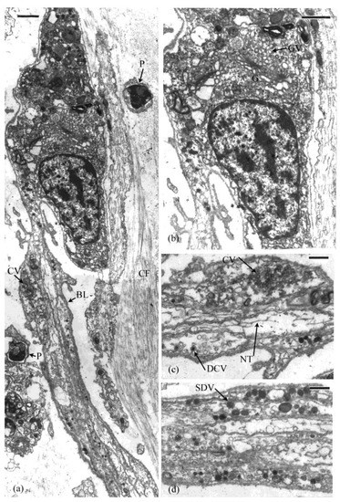 (a–d) Transmission electron micrographs of a nerve bundle in the introvert connective tissue. The nerve bundle and associated cell are encased in a basal lamina (BL) and the axons contain clear vesicles (CV), small dense vesicles (SDV), dense core vesicles (DCV), and neurotubules (NT). CF, collagen fibrils; G, Golgi complex; GV, Golgi vesicles; P, phagocyte. Scales: (a,b) = 1 µm, (c,d) = 0.5 µm.