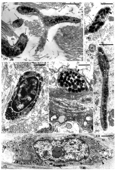 Transmission electron micrographs of processes and cells containing dense vesicles that vary in size and shape. (a) Process in the dense connective tissue layer of the introvert where tangential sections (arrows) indicate that these profiles may be a part of an anastomosing process. Note the basal lamina (BL) cover. (b) Elongated (arrow) and round (arrowhead) vesicles in the same process in the introvert. (c) Cell body containing dense vesicles the introvert. (d) Dense vesicles apposed to collagen fibrils (CF) in the tendon. (e) Dense vesicle process in gut connective tissue. (f) Cell body in the tendon connective tissue containing dense vesicles that range in size and profile (arrows, round to elongate vesicles). G, Golgi complex, ER endoplasmic reticulum, M, mitochondrion. (a,c,f) = 1 µm, (b,d,e) = 0.5 µm.