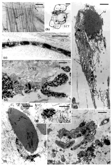 Ultrastructural examination of the autotomy structures of E. quinquesemita and the cell and tissue changes that occur during evisceration indicate a catastrophic loss in the structural integrity of the MCT [15,16]. As autotomy and evisceration are under neural control, particular attention was paid to neuronal elements in the autotomy structures. During autotomy, the ECM in the three autotomy structures takes on a hydrated-dissolved appearance. This is associated with interfibrillar slippage and disarray of the collagen fibrils and microfibrils but these fibrillar elements remain intact (Figure 7a). The cellular components normally supported by the connective tissue (e.g., axons, neurosecretory-like processes, muscle cells, morula cells) become physically damaged and torn and disperse into the coelom (Figure 7d,e,h).