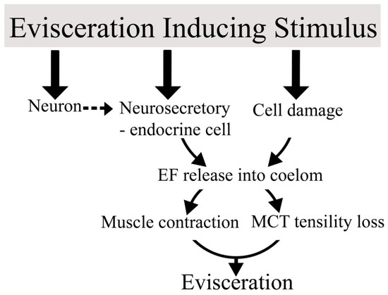 Hypothetical model of the sequence of events leading to autotomy and evisceration with involvement of a neurosecretory-like cascade and cell and tissue responses. It is proposed that the inducing stimulus (e.g., sea star predator) activates neurons which stimulate evisceration factor (EF) producing neurosecretory-endocrine cells resulting in release of EF into the coelomic fluid or directly activates EF producing cells. The process may also result in cell damage releasing EF into the coelom.