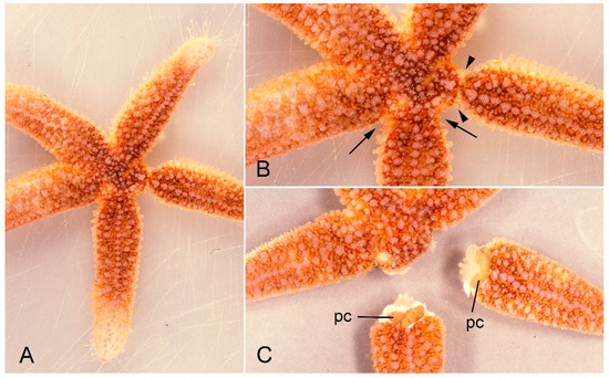 A specimen of Asterias rubens undergoing arm autotomy after intracoelomic injection of 0.56 M KCl. (A) General view of whole animal. (B) One arm shows basal constriction at the level of the autotomy plane (arrows) and the adjacent arm is undergoing detachment (arrowheads). (C) After complete detachment of both arms. pc, pyloric caeca.