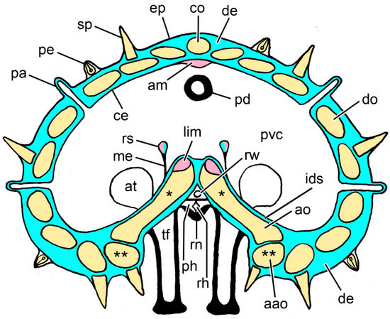 Diagram of a transverse section of an arm of Asterias rubens at the level of the autotomy plane. Not to scale. Blue: collagenous tissue; pink: muscle; yellow: ossicles; aao, adambulacral ossicle; am, apical muscle; ao, ambulacral ossicle; at, ampulla of tube-foot; ce, coelothelium; co, carinal ossicle; de, dermis; ep, epidermis; ids, inner dermal sheath; lim, longitudinal interambulacral muscle; me, mesentery; pa, papula; pd, pyloric duct; pe, pedicellaria; ph, perihaemal canal; pvc, perivisceral coelom; rh, radial haemal sinus; rn, radial nerve cord; rs, retractor strand; rw, radial water vascular canal; sp, spine; tf, tube-foot. * Adjacent pairs of ambulacral ossicles are connected by longitudinal interambulacral ligaments (not shown). ** Adjacent adambulacral ossicles are connected by longitudinal interadambulacral ligaments and muscles (not shown).