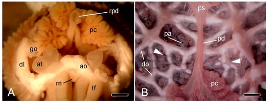The available information on the morphology and composition of the extrinsic stomach retractor apparatus (ESRA) of A. rubens and its close relative A. forbesi is limited to its histological organisation and histochemical properties [56,57,58]. Anderson [56] also provided a detailed historical account of views on its structure and function.