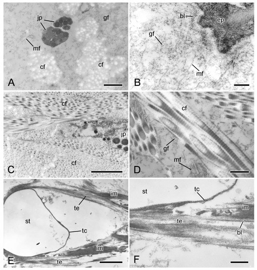 Transmission electron microscopy (TEM). Ultrastructure of dorsolateral body wall: extracellular components. (A) Expanded sparsely fibrous layer (ESFR) of outer dermis: general view. Transverse sections of collagen fibrils appear as electron-lucent spaces. Scalebar = 1 µm. (B) ESFR adjacent to epidermis. Scalebar = 0.2 µm. (C) Inner dermis: general view. Scalebar = 2 µm. (D) Inner dermis. Scalebar = 0.5 µm. (E,F) Tendons of interossicular muscle. (E) General view. Scalebar = 2 µm. (F) Junction between tendon and stereom trabecular coat. Scalebar = 0.5 µm. bl, basal lamina; cf, collagen fibril; ep, epidermis; gf, granulo-filamentous material; im, interossicular muscle; jp, juxtaligamental cell process; mf, microfibril; st, decalcified stereom bar; tc, trabecular coat; te, tendon ((A) adapted by permission of Taylor and Francis Group, LLC, a division of Informa plc., from reference [19], copyright 1990).