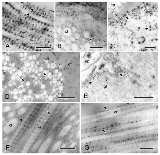 TEM. Proteoglycan histochemistry of dorsolateral body wall. (A–E) ESFR. (A–C) Cupromeronic blue (method of Erlinger et al. [37]). (A) Longitudinal section of collagen fibrils showing electron-dense deposits arranged regularly at each D-period (arrowheads). Scalebar = 0.2 µm. (B) Transverse sections of collagen fibrils with deposits appearing as interfibrillar bridges (arrowhead). Scalebar = 0.2 µm. (C) ESFR adjacent to epidermis, with deposits at basal lamina and in granulo-filamentous areas (arrowheads). Scalebar = 0.2 µm. (D,E) Polyethyleneimine (method of Sauren et al. [36]). (D) Electron-dense granules located on outer surface of collagen fibrils (arrowheads). Scalebar = 0.5 µm. (E) Adjacent to epidermis, basal lamina is labelled (arrowheads) but granulo-filamentous areas are unlabelled. Scalebar = 0.5 µm. (F,G) Inner dermis. (F) Cupromeronic blue: deposits arranged D-periodically on surface of collagen fibrils and forming interfibrillar bridges (arrowheads). Scalebar = 0.2 µm. (G) Polyethyleneimine: electron-dense granules arranged D-periodically. Scalebar = 0.2 µm. bl, basal lamina; cf, collagen fibril; ep, epidermis; gf, granulo-filamentous material.