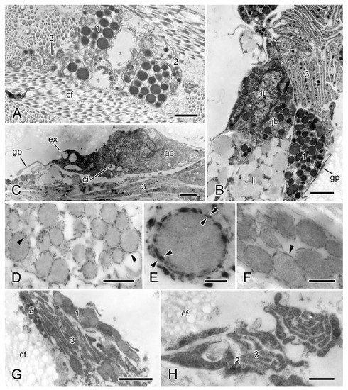 TEM. Ultrastructure of dorsolateral body wall: cellular components of inner dermis. (A–F) Intact body wall. (A) Three types of LDCV-containing JLC processes are present (1–3). Scalebar = 1 µm. (B) Aggregation of cell bodies and processes. Type 1 and 3 JLC processes and a nucleated type 1 juxtaligamental cell body are visible. Another cell body contains many presumptive lipid droplets. Scalebar = 1 µm. (C) Edge of cellular aggregation with possible gliocyte. Scalebar = 1 µm. (D–F) LDCVs of JLCs in sections stained with cupromeronic blue. (D) ESFR. Electron-dense deposits are present at LDCV membranes (arrowheads). Scalebar = 0.5 µm. (E) ESFR. Type 1 LDCV showing paired deposits separated by vesicle membrane (arrowheads). Scalebar = 0.1 µm. (F) Inner dermis. Electron-dense deposits are present at LDCV membranes (arrowhead). Scalebar = 0.2 µm. (G,H) JLC processes in autotomising body wall. (G) Type 1 LDCVs (1) show reduction in electron density, which is not evident in type 2 LDCVs (2). Scalebar = 1 µm. (H) Cluster of type 2 and 3 JLC processes alone. Scalebar = 0.5 µm. cf, collagen fibrils; ci, cilium; ex, vesicle undergoing exocytosis; jb, juxtaligamental cell body; gc, possible gliocyte; gp, possible gliocyte process; li, possible lipid inclusion; nu, nucleus ((G) and (H) adapted by permission of Taylor and Francis Group, LLC, a division of Informa plc., from reference [19], copyright 1990).