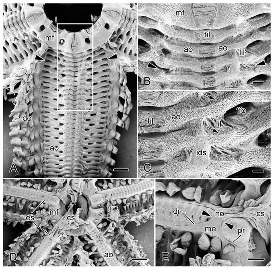 Scanning electron microscopy (SEM). Dorsal views of specimens of A. rubens from which most of dorsolateral body wall has been removed. (A–C) Soft tissues incompletely digested with bleach. (A) General view of one arm and adjacent mouth frame. Arrowheads indicate commonest level of breakage at autotomy (in larger animals). Box delineates margins of isolated preparations of ambulacral body wall used in physiological experiments (see Section 3.2). Scalebar = 1 mm. (B) More magnified view of proximal portion of specimen in A. Arrowheads indicate commonest level of breakage at autotomy. Scalebar = 0.2 mm. (C) Three interambulacral joints showing remnants of collagenous components. Arrows indicate attachment areas of longitudinal interambulacral muscles, which have been completely digested. Scalebar = 0.1 mm. (D,E) Undigested specimen showing location of extrinsic stomach retractor apparatus (ESRA). (D) General view. Scalebar = 1 mm. (E) ESRA associated with one arm. Arrowheads indicate location of autotomy breakage zone. Scalebar = 0.4 mm. ao, ambulacral ossicle; cs, cardiac stomach; do, dorsolateral ossicles; dr, distal retractor strand; es, extrinsic stomach retractor apparatus; ids, inner dermal sheath; lil, longitudinal interambulacral ligament; me, mesentery; mf, mouth frame; no, nodule; pr, proximal retractor strand; tfo, opening for tube-foot; til, transverse interambulacral ligament.