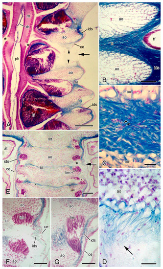 The epidermis that is adjacent to the adambulacral ossicles resembles that of the dorsolateral body wall, whereas, on the adradial side of the tube-feet, i.e., at the apex of the ambulacral groove, it takes the form of a pseudostratified neuroepithelium that constitutes the radial nerve cord [23,48]. The coelothelium of the ambulacral body wall is a simple cuboidal epithelium. The dermis is occupied mostly by a longitudinal series of ambulacral and adambulacral ossicles, each of which, as in the dorsolateral body wall, is completely surrounded by, and connected to, fibrous collagenous tissue, except at the attachment areas of interossicular muscles. Collagenous tissue is thus present both as interossicular ligaments and as a continuous inner dermal sheath on the dorsal and ventral sides of the ossicles (Figure 8B,C and Figure 9A,B,E).