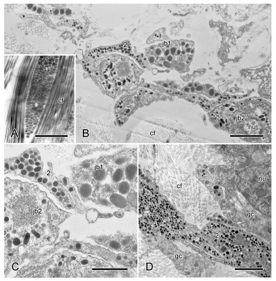 TEM. Ultrastructure of longitudinal interambulacral ligament. (A) Longitudinal and transverse sections of collagen fibres, each fibre comprising a tightly packed bundle of fibrils. Scalebar = 1 µm. (B) Cellular aggregation. Two types (1, 2) of JLC processes and somata are present. Scalebar = 2 µm. (C) Enlarged detail of JLC components in (B). Scalebar = 1 µm. (D) Cellular aggregation that includes presumptive gliocyte components adjacent to type 2 JLC processes. Scalebar = 2 µm. cf, collagen fibrils; gc, presumptive gliocyte; jb, juxtaligamental cell body; nu, nucleus.