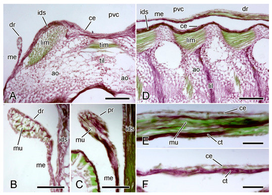 LM. Histology of extrinsic stomach retractor apparatus. Transverse (A–C) and horizontal (D–F) sections stained with Halami’s aldehyde fuchsin and light green [59]: collagenous tissue is purple, muscle and other cellular tissues green. (A) General view of dorsal region of one half of ambulacral ridge, including distal retractor strand. Scalebar = 0.1 mm. (B) Distal retractor strand and mesentery. Scalebar = 40 µm. (C) Proximal retractor strand and mesentery. Scalebar = 40 µm. (D) General view of one half of ambulacral ridge, including distal retractor strand. Scalebar = 0.1 mm. (E) Distal retractor strand. Scalebar = 20 µm. (F) Distal mesentery. Scalebar = 20 µm. ao, ambulacral ossicle; ce, coelothelium; ct, collagenous tissue; dr, distal retractor strand; ids, inner dermal sheath; lil, longitudinal interambulacral ligament; lim, longitudinal interambulacral muscle; me, mesentery; mu, muscle; pvc, perivisceral coelom; til, transverse interambulacral ligament; tim, transverse interambulacral muscle.