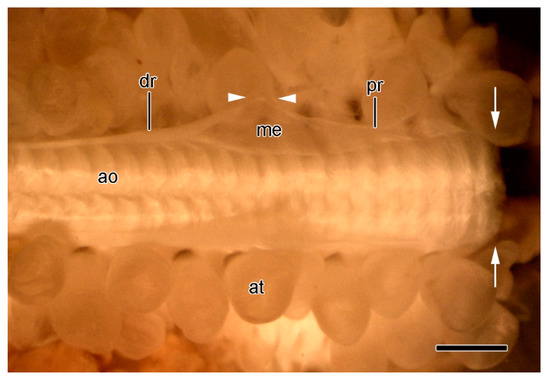 STM. Extrinsic stomach retractor apparatus (ESRA) immediately after autotomy. Dorsal view of ambulacral ridge; dorsolateral body wall removed. Distal end is on left. Arrows show location of ambulacral breakage plane. Components of ESRA on only one side are labelled. Arrowheads indicate location of ESRA breakage point. Scalebar = 1 mm. dr, distal retractor strand; ao, ambulacral ossicle; at, ampulla; me, mesentery; pr, proximal retractor strand.