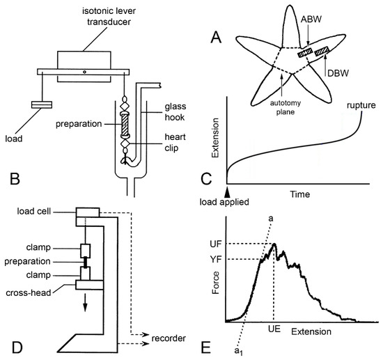 Mechanical tests. (A) Position of proximal dorsolateral body wall preparations that include autotomy plane (ABW) and distal preparations that lack it (DBW). (B) Diagram (not to scale) of apparatus used in creep tests in which preparations were subjected to constant load. (C) Idealised extension curve of ABW preparation under constant load. (D) Diagram (not to scale) of mechanical testing machine used for force-extension tests in which dorsolateral body wall preparations were stretched at a predetermined rate. (E) Force-extension curve showing measured parameters: ultimate extension (UE), from which ultimate strain was calculated (change in length/initial length), ultimate force (UF) from which ultimate stress was calculated (UF/cross-sectional area), yield force (YF) from which yield stress was calculated (YF/cross-sectional area), and slope of linear portion of curve (a…a1) from which Young’s modulus was calculated (Δstress/Δstrain, i.e., Δ(force/cross-sectional area)/Δ(extension/initial length)) ((D,E) adapted with permission of Springer Nature from reference [15], copyright 2000).