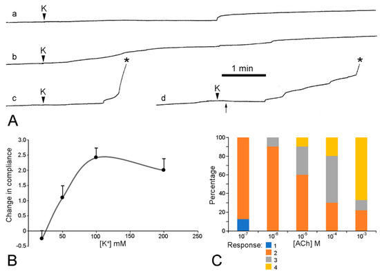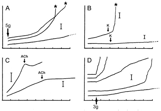 Extension curves of isolated dorsolateral body wall preparations subjected to constant load (see Figure 13B,C). Horizontal axis: time (min); vertical axis: extension, vertical bars indicating 1 mm; stars indicate rupture. (A) Normal extension curves of ABW preparations: three preparations from one animal. (B) Effect of 100 mM K+: typical response of ABW (upper curve) and DBW (lower curve) preparations. (C) Effect of 10−3 M acetylcholine on ABW preparations: usually acetylcholine caused sustained arrest of extension (lower curve); very rarely, it caused transient contraction (upper curve). (D) Effect of atropine alone: five ABW preparations from one animal which were immersed in either 10−3 M atropine (upper three curves) or sea-water alone (lower two curves) for 5 min before load was applied (adapted with permission of Taylor and Francis Group, LLC, a division of Informa plc., from reference [19], copyright 1990).