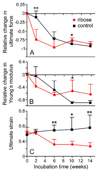 - Gautieri, A.; Passini, F.S.; Silván, U.; Guizar-Sicairos, M.; Carimati, G.; Volpi, P.; Moretti, M.; Schoenhuber, H.; Redaelli, A.; Berli, M.; et al. Advanced glycation end-products: Mechanics of aged collagen from molecule to tissue. Matrix Biol. 2017, 59, 95–108. [Google Scholar] [CrossRef] [PubMed]