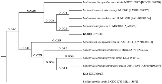 The strains of lactic acid bacteria were identified at the molecular level. The partial 16s rRNA gene was amplified by PCR using universal primers [37]. The sequences were analyzed with the MEGA7 software and compared with the NCBI database. The strain was registered in the NCBI database. Sequences were entered into the NCBI database under the access codes ON734020 (S. harbinensis strain K4.5) and ON734021 (L. kefiri strain K6.10).