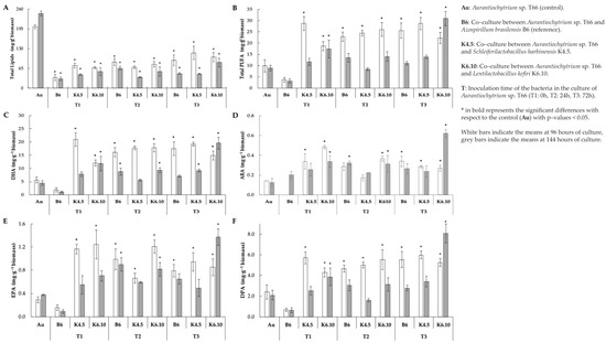 Regarding co-cultures, it has been reported that the Pelagibaca bermudensis strain KCTC 13073BP can stimulate 2 fold the cell density of the microalga Tetraselmis striata, and that the total productivity of biomass and lipids can be substantially promoted by bacterial inoculation in the medium [28]. Rhizobium sp. can exert a mutualistic effect by interacting by co-culture, where the microalgae Chlamydomonas reinhardtii, Chlorella vulgaris and Scenedesmus sp. show increases in their growth under co-culture conditions, reaching an increase in growth ratios of up to 110%, in the case of Chlorella vulgaris [29]. These results are in contrast with our study on which the co-cultures show that the time of inoculation is an important factor when obtaining bioactive compounds of interest. Figure 2 shows how the final biomass obtained varies with the timing of bacteria inoculation. For example, in the culture of Aurantiochytrium sp. T66, in the case of co-culture with the bacteria L. kefiri K6.10, there is a significant decrease in biomass at the end of the culture (1.09 g L−1) compared to the control without bacteria (2.62 g L−1) when the bacteria are inoculated at the beginning of the culture (0 h) and to the extent that the bacteria is integrated at times after the beginning of the culture (24 and 72 h) the differences found are not significant. Other treatments generated a significant decrease in the biomass at the end of the culture, in all the inoculation times tested. These changes could be attributable to multiple factors, such as availability of nutrients, changes in pH, dissolved oxygen, among others.