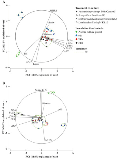 The Principal Component Analysis (PCA) for 96 h after starting the culture (Figure 3A) explained 78.3% of the total variance (Table S1), where the first component (44.8%) is associated with the PUFA profile (PUFA, DHA, ARA, EPA, 20:5 n-3), DPA content and pH, and the second component (33.5%) was associated with total lipids, saturated fatty acid (SAFA) and monounsaturated fatty acid (MUFA) content. Direct significant correlations with the profile of PUFAs were observed in several cases: PUFA (r = 0.6), DHA (r = 0.6), ARA (r = 0.5), EPA (r = 0.4) and DPA content (r = 0.6) (Table 5). An inverse correlation was noted between IAA production and pH (r = −0.5), biomass (r = −0.4), lipids (r = −0.4) and SAFA (r = −0.4), as well as an inverse correlation between pH and MUFA (r = −0.8), PUFA (r = −0.4), DHA (r = −0.4), ARA (r = −0.4), and EPA (r = −0.4) content, 96 h after initiation of the culture. These results highlight that the treatments evaluated (bacteria and inoculation time) after 96 h of culture promote a positive relationship with the increase in total PUFA, particularly DPA, DHA, ARA and EPA.