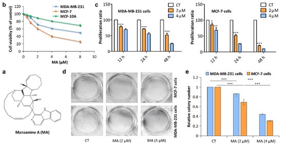 Marine invertebrates have been considered as a vital source of pharmacologically bioactive natural products []. The manzamines are a class of β-carboline alkaloids extracted from marine sponges with a nitrogen-containing polycyclic system []. As a representative compound of this class, Manzamine A (MA) has been reported to have anti-malarial, anti-microbial, anti-inflammatory, anti-aging, anti-atherosclerosis activities [,,,], and so on. Recently, a growing body of evidence demonstrates that it also has anticancer effects on several types of cancer, such as cervical cancer [], pancreatic cancer [], colorectal cancer [], and glioblastoma [], by the induction of cell apoptosis, cell autophagy, cell cycle arrest, and the inhibition of cell migration/invasion. However, whether it has this activity against breast cancer and the underlying mechanism of it remain unclear.