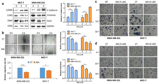 To investigate whether MA affected cell migration and invasion, we detected the Epithelial–Mesenchymal Transition (EMT)-associated protein markers in MA-treated MDA-MB-231 and MCF-7 cells by Western blotting. The results displayed that MA dose-dependently decreased the proteins level of Snail and Vimentin (mesenchymal markers), while it increased the protein level of E-cadherin (epithelial marker) (Figure 2a). Additionally, we assessed the effect of MA on the migration of breast cancer cells using scratch wound assay. The result showed that MA inhibited the relative migration of the cells at 6 h after wounding versus the CT group (Figure 2b). Consistent with the result by scratch wound assay, the images of transwell assay further showed that MA significantly reduced the number of migrated cells and invaded cells compared to the controls photographed by a microscope at magnification of 4×, 10×, and 20× (Figure 2c,d). Altogether, these results demonstrated that MA inhibits the migration and invasion in breast cancer cells.
