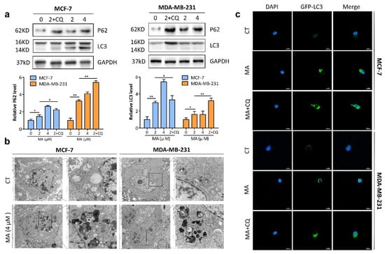 To explore the effect of MA on autophagy in breast cancer cells, MDA-MB-231 and MCF-7 cells were treated with MA for 24 h followed by Western blot analysis. As shown in Figure 3a, the accumulation of autophagosome marker LC3Ⅱ was dose-dependently increased. However, P62, another marker that inversely correlates with autophagic activity [], was also remarkably increased in a dose-dependent manner, suggesting the induction of autophagosome formation but the inhibition of autophagosome degradation after MA treatment. Furthermore, the above regulatory effects of MA on autophagy can be enhanced by CQ (inhibitor of autophagosome–lysosome fusion). In addition, TEM, the gold standard for observing the morphology of autophagosomes, was conducted. As anticipated, double- or multi-membrane structures were accumulated in MA-treated MCF-7 and MDA-MB-231 cells (Figure 3b). MCF-7 and MDA-MB-231 cells transiently expressing GFP-LC3 incubated with MA and/or CQ for 24 h were imaged by confocal microscopy and the results displayed distinct punctae distribution in line with autophagosome formation. Accordingly, breast cancer cells treated with MA in combination with CQ resulted in an significant increase in fluorescence intensity compared to the cells treated with MA alone (Figure 3c). Overall, these data suggested that MA inhibits the last step of the autophagic process by preventing autophagosome turnover.
