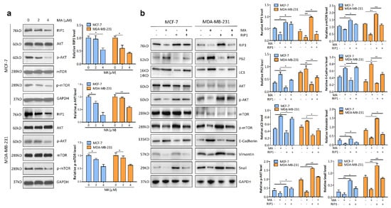 The AKT/mTOR axis is a classic signaling pathway in cancers that blocks catabolic activities, such as autophagy []. We therefore examined whether the AKT/mTOR pathway is required for MA-induced autophagy. After being incubated with increasing concentrations (0, 2, 4 μm) of MA for 24 h, MCF-7 and MDA-MB-231 cells were harvested for immunoblotting assay. The results showed that the phosphorylation level of AKT and mTOR were dose-dependently decreased after MA treatment. We also detected the expression level of RIP1 kinase, a key upstream regulator that controls autophagy by phosphorylating the critical components of the signaling pathways []. The results showed that the expression of RIP1 was dose-dependently down-regulated in MCF-7 and MDA-MB-231 cells treated with MA (Figure 4a). Moreover, overexpression of RIP1 significantly increased phosphorylation levels of AKT and mTOR, reduced the accumulation of LC3II and P62, and greatly promoted EMT ( E-Cadherin↓, Snail, and Vimentin↑) compared with the non-transfection group (Figure 4b), suggesting that RIP1 mediates MA-induced autophagy through the AKT/mTOR pathway in MCF-7 and MDA-MB-231 cells.