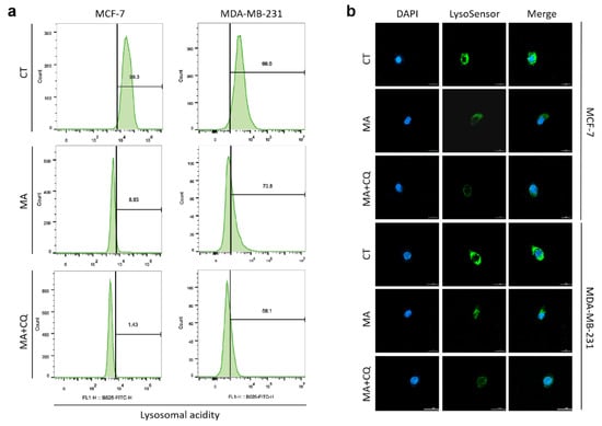 The low intralysosomal pH activates resident hydrolases responsible for the degradation of various cargos delivered by autophagic processes []. To determine whether the reduction in the degradation of autophagosomes produced by MA was correlated with lysosomal acidity, MCF-7 and MDA-MB-231 cells were treated with MA and/or CQ for 24 h followed by the acidic probe lysosensor dye staining, and then analyzed by flow cytometry and visualized by immunofluorescence microscopy, separately. The results of the flow cytometry analysis demonstrated that MA treatment resulted in a marked decrease in intralysosomal acidity when compared to the CT group, and CQ could further enhance this effect (Figure 5a). Consistent with the result by flow cytometry analysis, immunofluorescence showed a significant decrease in fluorescent intensity in MA-treated cells compared to DMSO-treated cells, which was further attenuated by CQ treatment (Figure 5b). These data indicated that MA reduces lysosomal acidity in breast cancer cells, which might be the reason why the degradation of autophagosomes is impaired by MA.