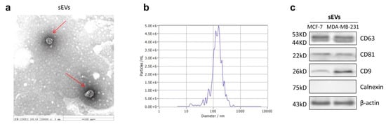sEVs were isolated and purified from MDA-MB-231 and MCF-7 cell culture supernatant by differential ultracentrifugation as described previously []. Briefly, cells were cultured in 1640 and DMEM supplemented with 10% sEV-depleted fetal bovine serum for 48 h, then cell culture supernatant was harvested and centrifuged at 2000× g for 10 min to remove cells, 10,000× g for 30 min to remove cell debris. The resulting supernatant was filtered through 0.2 μm sterile filters (Millipore), followed by ultracentrifugation at 110,000× g for 70 min. The pellets were re-suspended in PBS and ultracentrifuged again at 110,000× g for 70 min. All centrifugations were performed at 4 °C.