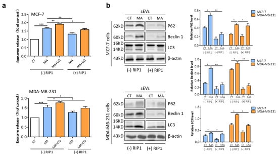 To clarify whether autophagosomes fuse with MVBs after the inhibition of lysosomes, the release of sEVs were detected by AchE assay following the identification of sEVs in terms of shape, size distribution, and specific protein markers. We found that MA stimulates sEV release in comparison with the CT group. Additionally, this effect was further potentiated by CQ, while it was attenuated by RIP1 overexpression in MDA-MB-231 and MCF-7 cells. Importantly, our results displayed the accumulation of autophagy-associated proteins (P62, Beclin 1, and LC3) in sEVs secreted by breast cancer cells treated with MA, but they were attenuated in sEVs derived from RIP1-transfected MDA-MB-231 and MCF-7 cells, indicating that autophagosomes can fuse with either lysosomes or MVBs, and further suggesting that the release of sEVs may compensate for lysosomal dysfunction. An influence of lysosome function on EV biogenesis suggests a mechanism for the coordinated regulation of autophagy and EV release under physiological conditions. In conclusion, we demonstrated the anticancer effects of MA with considerable promise in targeting breast cancer cells.