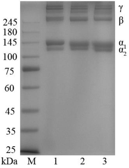 - Wang, L.; Liang, Q.; Chen, T.; Wang, Z.; Xu, J.; Ma, H. Characterization of collagen from the skin of Amur sturgeon (Acipenser schrenckii). Food Hydrocoll. 2014, 38, 104–109. [Google Scholar] [CrossRef]