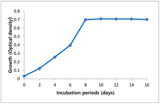 Growth curve of Arthrospira platensis cultivated on Zarrouk medium during incubation period.