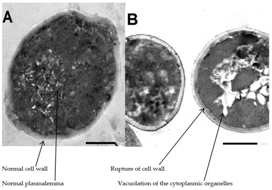 Transmission electron micrograph. (A) Untreated Candida conidia. (B) Treated Candida conidia by Arthrospira platensis extracts. Mag (×40,000).