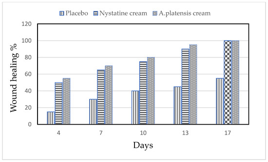 The alleviation of the wound area in the placebo treated group was low when compared to the A. platensis extract cream- and nystatin-treated groups (G3, G4). The healing of the wound recorded for nystatin was 50–90% from days 4 to 13 after treatment. However, A. platensis extract cream caused wound healing of 55–95% from days 4 to 13 after treatment, as shown in Table 2 and Figure 4 and Figure 5. The data detected that the maximal healing of wounds was by A. platensis cream as compared with nystatin and the placebo cream base. The lowest redness of wound and moderate hair growth was observed after 13 days of applying A. platensis extract cream; moreover, at the end of the 17-day study period, there was complete removal of inflammation and massive hair growth.
