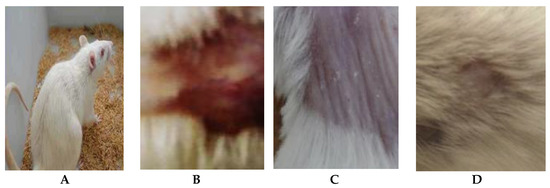 Efficacy assessment of wound healing in mice infected with C. albicans after 17 days of infection. (A) Healthy mice, (B) Placebo treatment, (C) Nystatin treatment and (D) Arthrospira platensis extract cream.