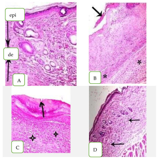 Histopathological examination of skin mice groups. (A) Healthy mice, (epi) epidermis layer, (de) dermis layer, (B) Infected non-treated skin, (C) Nystatin treatment and (D) Arthrospira platensis extract cream.