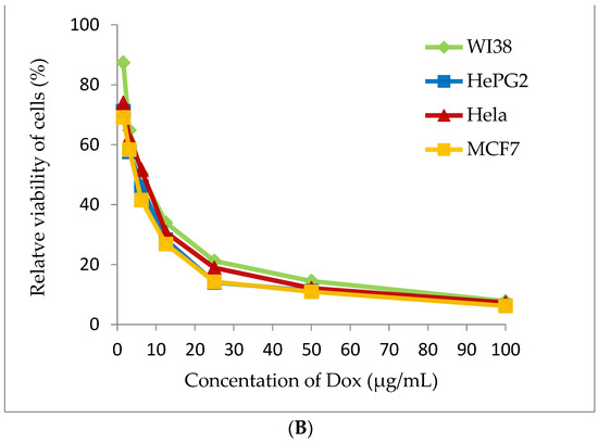 Cytotoxicity assay (A) Arthrospira platensis methanolic extract, (B) Doxorubicin (standard anticancer) on different cell lines by MTT method.